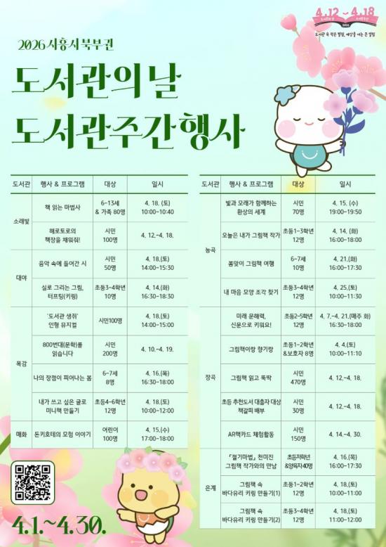 ±â³ä ÇÁ·Î±×·¥µµ ´Ù¾çÇÏ°Ô ÁøÇàµÈ´Ù. À¯¾Æ ´ë»óÀ¸·Î´Â ¸ñ°¨µµ¼°üÀÇ ¡®³ªÀÇ ÀåÁ¡ÀÌ ÇǾ´Â º½¡¯, ´É°îµµ¼°üÀÇ ¡®º½¸ÂÀÌ ±×¸²Ã¥ ¿©Ç࡯ÀÌ ÀÖ´Ù. ¾î¸°ÀÌ ´ë»óÀ¸·Î´Â Àº°èµµ¼°üÀÇ ¡®±×¸²Ã¥ ¼Ó ¹Ù´ÙÀ¯¸® ¿¼è°í¸®(۸µ) ¸¸µé±â¡¯, Àå°îµµ¼°üÀÇ ¡®¹Ì·¡ ¹®ÇØ·Â, ½Å¹®À¸·Î Ű¿ö¿ä!¡¯ µîÀÌ ¸¶·ÃµÅ ´Ù¾çÇÑ ¹æ½ÄÀÇ µ¶¼ °æÇèÀ» Á¦°øÇÑ´Ù.